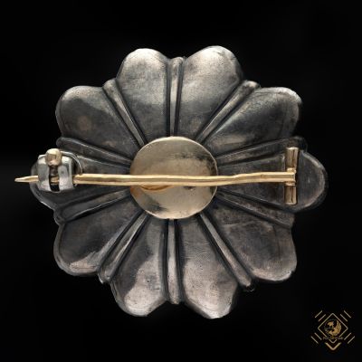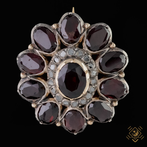 Delikatnie spłaszczona forma rozety ozdobiona granatami w towarzystwie rozet diamentowych. Oprawa kasetowa, zamknięta wykonana ze srebra. Szpila ze złota 19- sto karatowego. Stare szlify fasetowe podkreślają piękno granatów o barwie ciemnego burgunda a lśniące rozety diamentowe dopełniają całości.