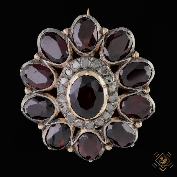 A slightly flattened form of a rosette decorated with garnets accompanied by diamond rosettes. Binding, closed, from silver, with a 19 carat gold pin. Old faceted cuts emphasize the beauty of the dark burgundy garnets, while shiny diamond rosettes complete the whole thing.