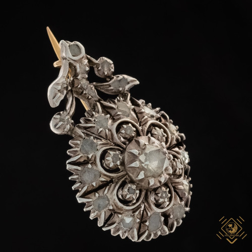 Piękny kwiat dla niezwykłej kobiety ceniącej urodę biżuterii antykwarycznej. Oprawa wykonana ze srebra łączonego ze złotem ozdobiona delikatnie połyskującymi rozetami diamentowymi.