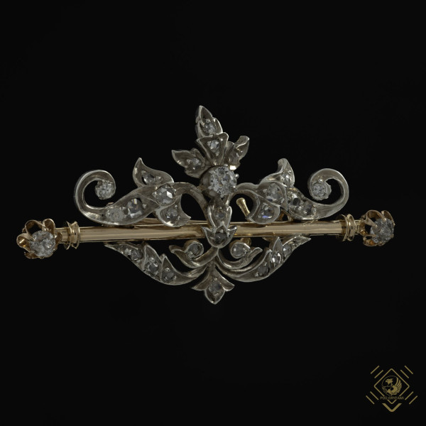 Silver and gold openwork design form, decorated with diamonds and diamond rosettes. The handmade lace work full of finesse is stunning in its execution. Another highlight is the artistic touch from the Maghreb region, from the 1920s, when most of the territories encompassing the region were under French protectorate, which was not without significance for the goldsmith's art. We can see the influence of the illustrious French masters of old jewellery work here.