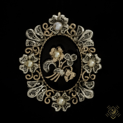 Broszo-wisior z rozetami diamentowymi, perłami i onyksem