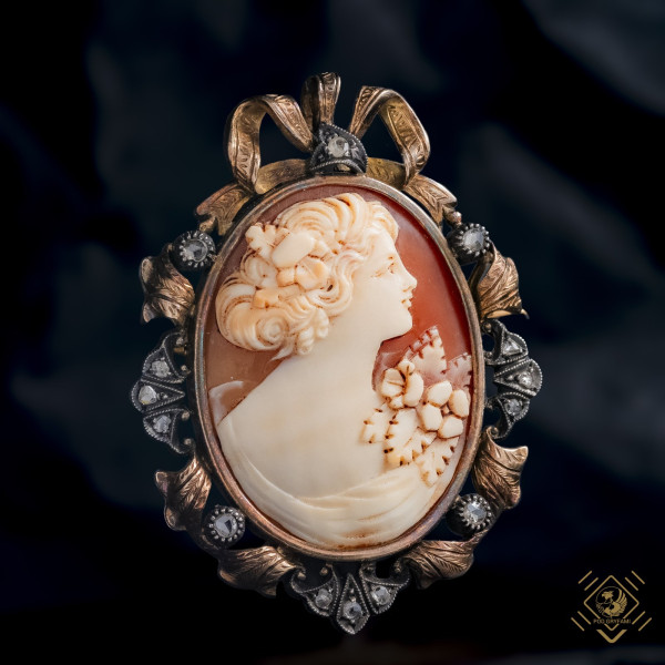 Extremely charming Cameo made in sea shell (Conchifera) designed as a brooch, although the unusual mounting of the bow crowning the oval frame allows the jewel to be used as a pendant. The central part features an image of a young lady. The elaborately crafted frame is decorated with diamonds in rosette cuts.