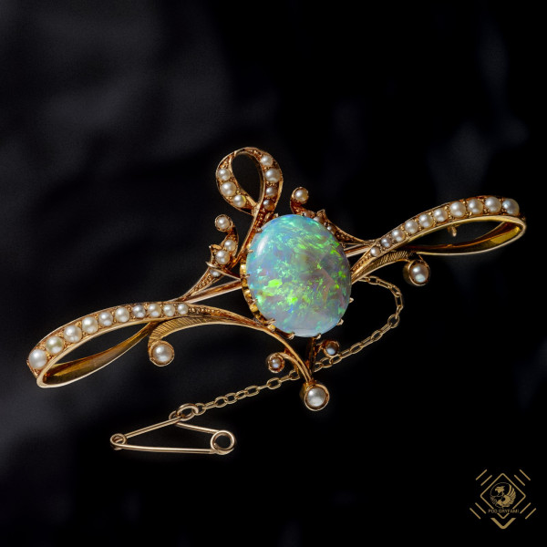 A brooch in the Art Nouveau style featuring a beautiful, wonderfully iridescent harlequin opal. The brooch features additional decoration in the form of tiny deep-sea pearls. An example of magnificent hand-made/goldsmith work, with a strong clasp for additional security.