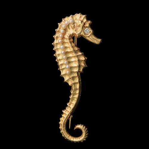 Oryginalny zoomorficzny projekt broszy przedstawiający konika morskiego ( hippocampus ). Wspaniała ręczna praca z idealnym cyzelunkiem w wysokiej próby złocie. Konik dekorowany niewielkim diamentem stanowiącym oko oraz dwunastoma perłami hodowlanymi. Brosza chociaż datowana na drugą połowę XX wieku to jednak kunsztem wykonania nie odbiega od naturalistycznych roślinnych i zoomorficznych projektów biżuterii z II połowy XIX wieku.