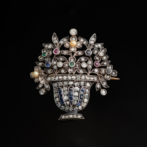 Kolejny niezwykły przykład naturalistycznego przedstawienia roślinności - niewielki koszyczek pełen kwiatów. Srebrno-złota konstrukcja przyozdobiona diamentami w starych szlifach old mine cut, rozetami diamentowymi, perłami, szafirami oraz rubinami. Majstersztyk jubilerskiej pracy ogrodniczej.