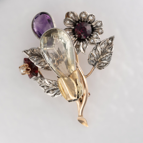 Kolejne nawiązanie do XIX wiecznych motywów florystycznych, które w mniej lub bardziej przetworzony sposób odzwierciedlały piękno natury. Srebrno-złota konstrukcja w formie gałązki kwiatowej zdobiona kwarcem, ametystem oraz granatem.