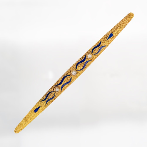 Klasyka prostoty wykonana w wysokiej próbie złota. Misterna ręczna praca złotnicza ozdobiona rozetami diamentowymi oraz kobaltową, wspaniale połyskującą emalią.