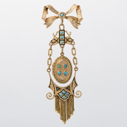Reprezentatywny przykład biżuterii sentymentalnej z przełomu XIX i XX wieku. Brosza wykonana w formie kokardy z podwieszanymi ruchomymi elementami, w środku których umieszczono wisior z funkcją sekretnika. Piękna kompozycja w złocie ozdobiona turkusami oraz czarną emalią. Niewielkie ubytki emalii nie umniejszają wartości broszy a jedynie podkreślają nieuchronny upływ czasu. Klejnot z duszą i elegancją właściwą epoce i jak to sekretnik owiany rąbkiem tajemnicy.
