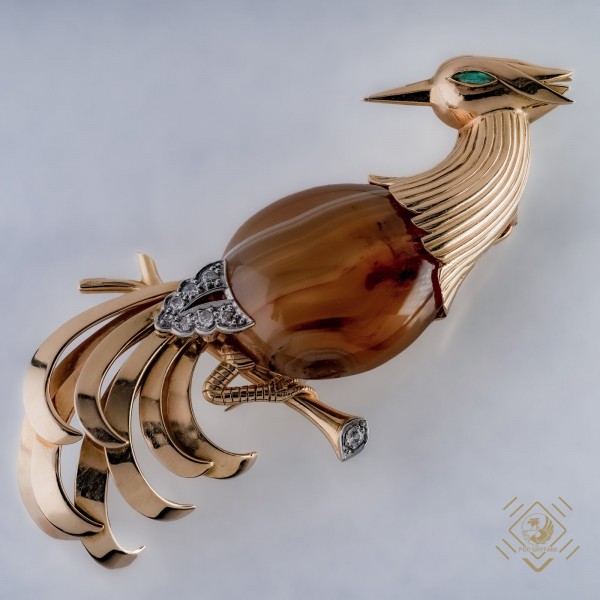 A rare collector's item made by French jewelers in 1945. The brooch depicts one of the few species of birds-of-paradise, which is perched on a golden branch, and closely watches the surroundings with its emerald eye. The body is made of 18-carat gold, and perfectly corresponds with the impressive striped agate imitating the torso of the bird. Sparkling platinum set diamonds accentuate the magnificence of the tail and adorn the end of the branch.