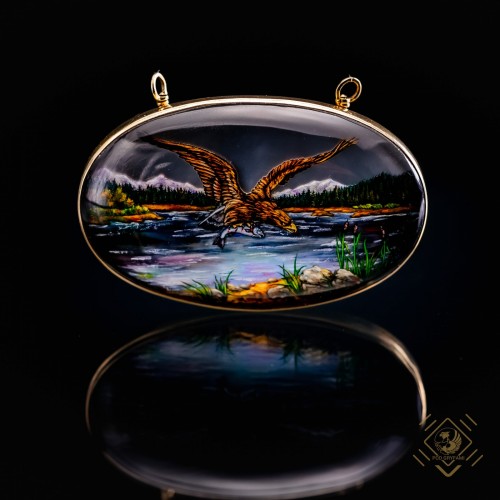 Prezentowana brosza powstała w 1925 roku i jest znakomitym przykładem zastosowania techniki essex crystal. Majestatyczny orzeł unoszący się nad mieniącą się taflą wody trzyma w szponach rybę. Całość oprawiona w 14 karatowe złoto. To piękne miniaturowe dzieło sztuki można wykorzystać jako wisior lub broszę dla kobiety lub efektowną zapinkę do fularu dla mężczyzny. Z pewnością będzie też ozdobą niejednej kolekcji miniatur.