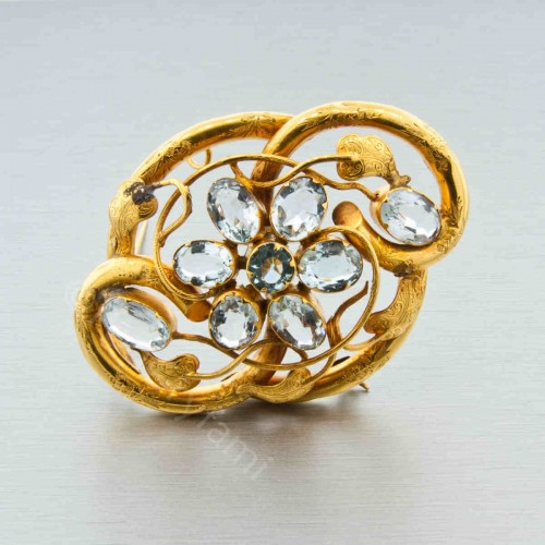 Prezentowana brosza to klasyczny przykład XIX wiecznej biżuterii biedermeierowskiej. Konstrukcja wykonana w złocie dętym, repusowanym w formie wijących się i splatających się ze sobą gałęzi oraz listków spomiędzy, których wyłania się kwiat zdobiony nieprzeciętnej urody bladoniebieskimi akwamarynami. Klejnot można nosić jako broszę lub na łańcuszku, czy też aksamitce jako wisior.