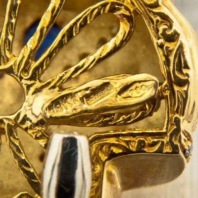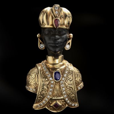 Złoto łączone z hebanem, diamenty, szafir i rubiny.