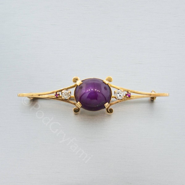 Elegance and class. Large 19-carat cabochon ruby in a delicate setting decorated with two old mine cut diamonds. Additionally, there are two small rubies placed at each end of the brooch. Recommended for women who appreciate charm and simplicity.