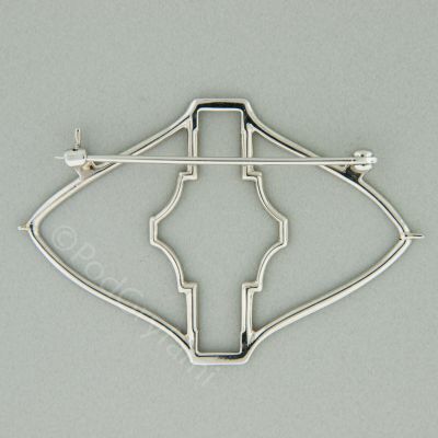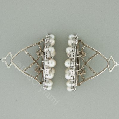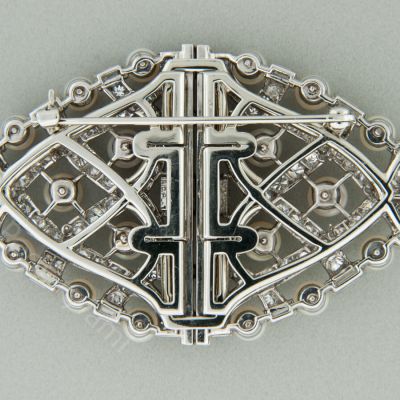 Platynowo złota brosza dekorowana siedmioma karatami diamentów o różnych kształtach. Idealnie dobrane kamienie - okrągłe oraz proste, lśniące bagiety. Dodatkowo dwadzieścia srebrzystobiałych pereł dodających delikatnego blasku. Całość można określić mianem klasycznej elegancji, a specjalna konstrukcja umożliwia rozłożenie broszy na dwie części, które można nosić oddzielnie.