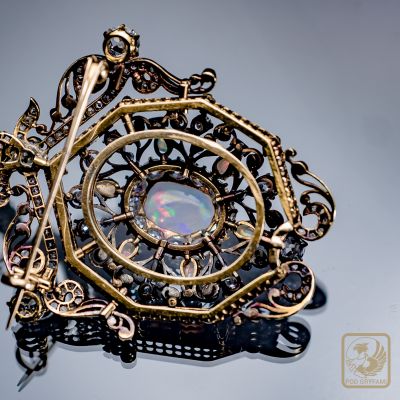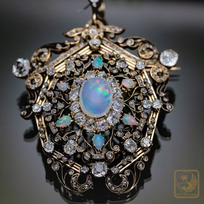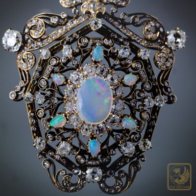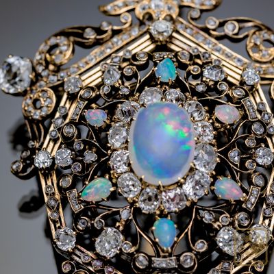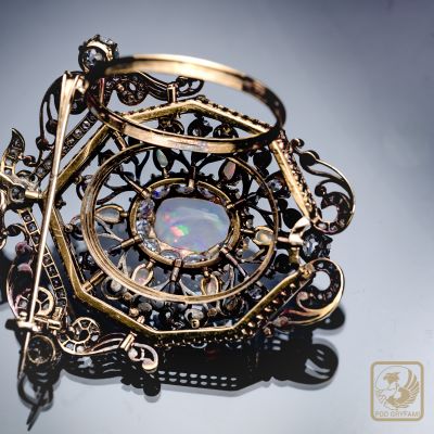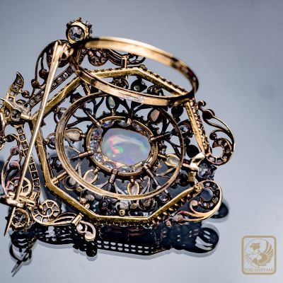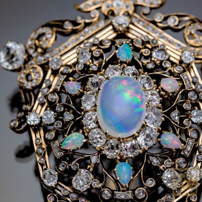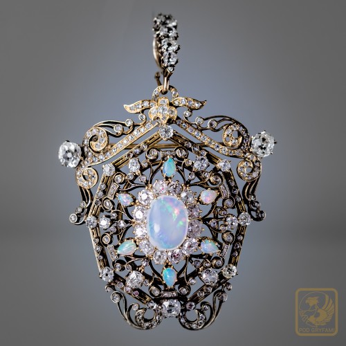 Okazały broszo-wisior wykonany pod koniec XIX wieku. Sercem klejnotu jest wspaniały mleczny opal z delikatną zielononiebieską iryzacją oprawiony w formie diamentowej karmazycji. Diamenty starego szlifu, licznie rozsiane rozety diamentowe, dodatkowo sześć opali szlifowanych w formie niewielkich łezek, piękna ażurowa forma, precyzja wykonania czynią z broszy absolutny rarytas na rynku biżuterii antykwarycznej.