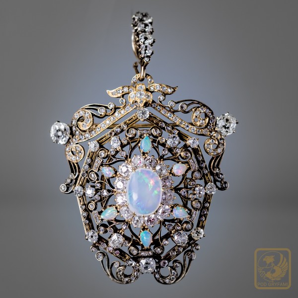 Brooch-medallion from the 19th century, with white opals and diamonds