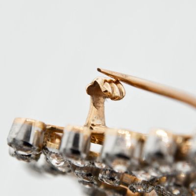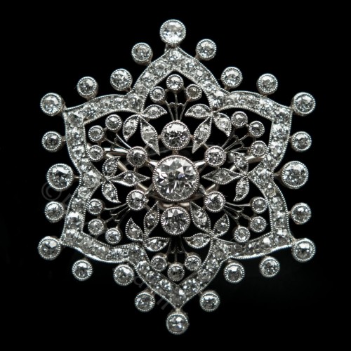 Niezwykle urocza brosza, typowy przykład Belle Epoque, datowana na około 1910 rok. Diamenty w historycznym szlifie old european cut oprawione w platynę. Korpus broszy wykonany jest ze złota o próbie 600 natomiast szpila 375. Dodatkową atrakcją jest możliwość wykręcenia szpili przez co uzyskujemy bardzo efektowny wisior. Ten uroczy klejnot o motywie płatka śniegu z pewnością należał do którejś z arystokratek pochodzących z jakże licznych dworów europejskich.