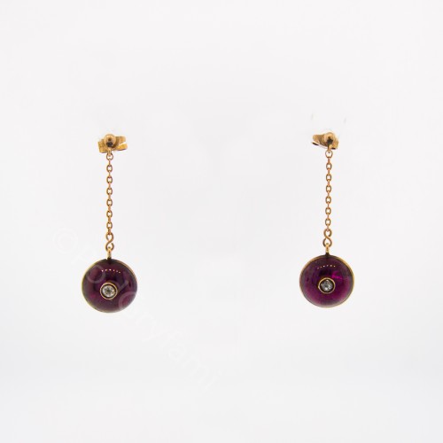 Długie kolczyki wykonane ze złota łączonego ze srebrem. Na delikatnym łańcuszku w oprawie ciągłej osadzony szlifowany w kaboszon granat. W centralnej części granatu umocowany niewielki diament, który swoją delikatną poświatą rozświetla ciemnofioletową barwę tego pięknego minerału.