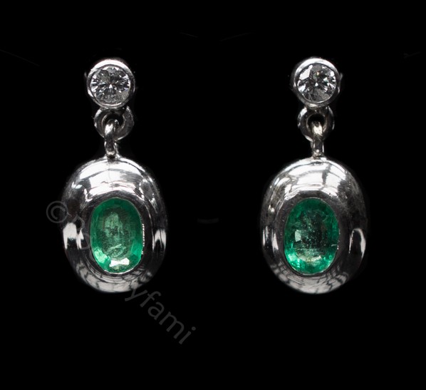 Delicate, small earrings made of white gold. Wire decorated with a round diamond. With an attached oval emerald. Subtle ear decoration.