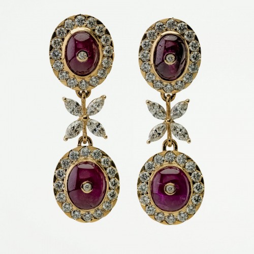 Ekskluzywne, koktajlowe kolczyki wykonane w 18 karatowym złocie. Dwa owalne elementy połączone ruchomym motylkiem ozdobionym diamentami o szlifie markizy. Centralnie osadzone rubiny, których głęboki, nasycony burgund został podkreślony przez połyskujący diamentowy szron. Świetne uzupełnienie wieczorowej kreacji nadające delikatności kobiecej szyi.
