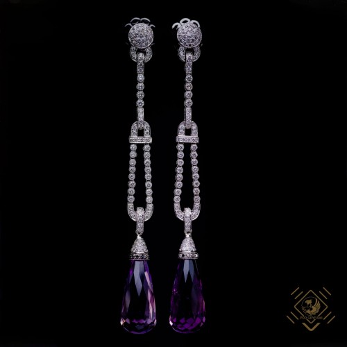 Eleganckie koktajlowe kolczyki wykonane w 18 karatowym złocie. Precyzyjnie oprawione lśniące niewielkie diamenty stanowią doskonały ,,wstęp" do jedynego w swoim rodzaju zakończenia, którego kwintesencją są piękne, duże ametystowe brioletty o barwie bladego wrzosu.