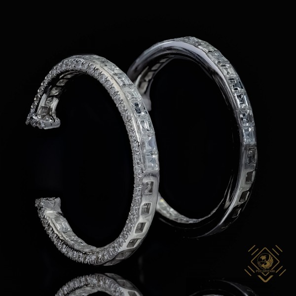 Absolute simplicity and classic form. Made in white gold and covered with diamond dust, these hoops look great on the ear.