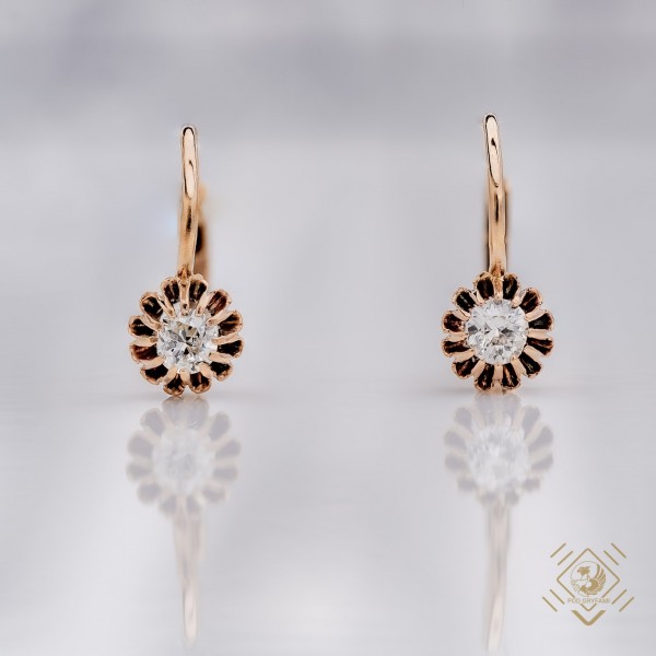 Delicately sparkling Old Mine cut diamonds, in a 14 carat gold prong setting. The shape of the piece harkens back to the beautiful jewelry of the Austro-Hungarian Empire period.