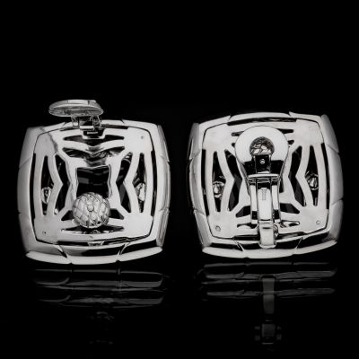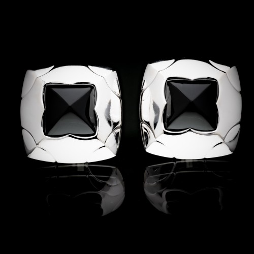 Prezentowana para klipsów została wykonana w białym 18 karatowym rodowanym złocie. W dosyć prostej oprawie centralnie osadzone lśniącoczarne onyksy, których trójkątny kształt nawiązuje do jednej z najbardziej tajemniczych budowli na ziemi jaką są piramidy. Ich doskonałe harmonijne proporcje urosły do rangi symbolu boskości duszy. Linia Pyramid firmy Bulgari należy do najbardziej topowych i rozpoznawalnych wzorów tej marki.