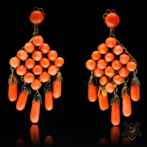 Zarówno do sukni szelestu jak i wzruszeń doskonale pasują przepiękne kolczyki, których konstrukcja została wykonana ze złoconego tombaku i ozdobiona naturalnymi koralami szlachetnymi ( corrallium rubrum). Korale szlifowane w kaboszony oraz sople, osadzone każdy osobno na pojedynczych drucikach. Szczególnie polecane dla miłośniczek Art Deco oraz nieprzemijającej urody korala.