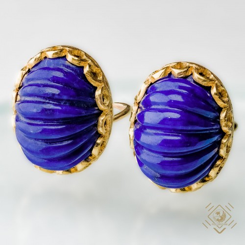 Ulubiona dekoracja włoskiego renesansu ornament godronowy posłużył mistrzowi jubilerstwa do wykonania tej niezwykłej pary kolczyków. W delikatnej złotej koronce pyszni się wspaniały lapis lazuli - lazuryt o głębokiej barwie ciemnego granatu z niewielkimi inkluzjami pirytowymi w kolorze starego złota. Urodę kamieni podkreśla fryz godronowy.