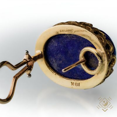 A favorite decoration of the Italian Renaissance, a godrooning technique was used by a master jeweler to create this unusual pair of earrings. In delicate gold lace there is a magnificent lapis lazuli - lazurite with a deep color of dark garnet and small pyrite inclusions in the color of old gold. The beauty of the stones is emphasized by the godroon frieze.