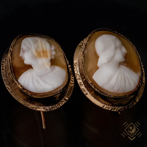 Prezentowane kolczyki zostały wykonane jako kamea w muszli morskiej ( Conchifera ) na początku XX wieku. W prostej złotej formie oprawione dwa różne wizerunki rzymskich patrycjuszek.