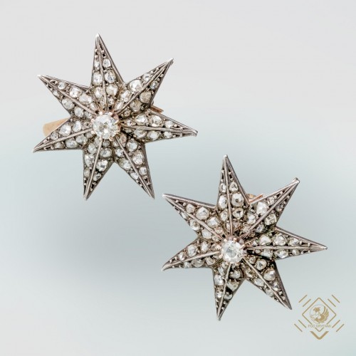 Delikatnie lśniące diamenty o starym szlifie old mine cut stanowią środek wspaniałej rozgwiazdy zdobionej rozetami diamentowymi. Kolczyki wykonano na początku XX wieku w bardzo przemyślny sposób łącząc patynowane srebro ze złotem. Dodatkowym atutem jest możliwość wykręcenia złotego zapięcia. Niezwykle wdzięczna ozdoba kobiecego ucha.