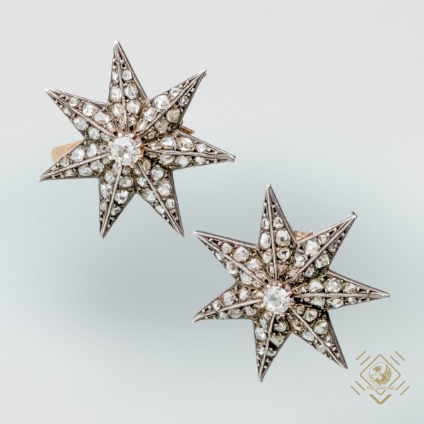 Delicately sparkling old mine cut diamonds form the center of this gorgeous starfish earring design adorned with diamond rosettes. Earrings were made in the early twentieth century in a very clever way combining patinated silver with gold. Another advantage is the ability to twist the gold clasp. This is an extremely graceful decoration for the female ear.