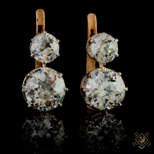 Okazałe diamenty w starych szlifach brylantowych ujęte w łapki dla podkreślenia żywego ognia kamieni. Ponadczasowa klasyka, prostota formy skupiająca całą uwagę na nieporównywalnym z niczym blasku diamentów.