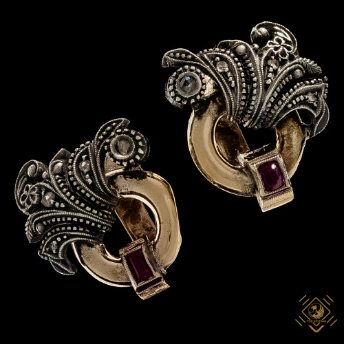 Oryginalna konstrukcja kolczyków nawiązująca w swojej formie do biżuterii z przełomu XIX i XX wieku z elementami charakterystycznymi dla epoki Art Deco. Połyskujące rozety diamentowe w towarzystwie dwóch rubinków Verneuila.