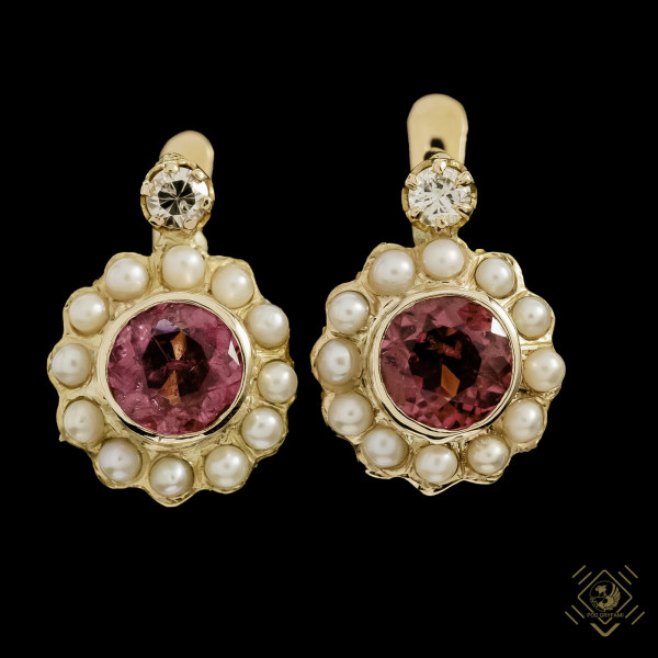 Extremely feminine, earrings that beautifully decorate the ear, the central part of which is made of purple-pink rubellite, which is a quite rare variety of tourmaline. Perfectly selected small pearls and two discreetly shining diamonds complete complete each earring.