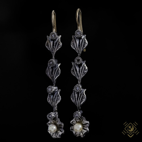 Wdzięczna kwiatowa forma ozdobiona perłami oraz rozetami diamentowymi. Na solidnej złotej bazie wykonany w srebrze delikatny florystyczny wzór składający się z czterech ruchomych elementów, z których trzy zdobią niewielkie rozety diamentowe a czwarty dodatkowo oprócz rozety wieńczy delikatna, kremowa perełka.