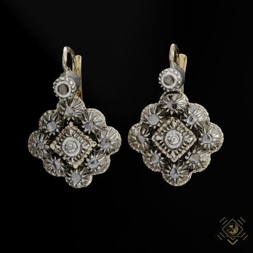 Ciekawy romboidalny kształt, w który wpisują się delikatnie połyskujące rozety diamentowe. Osadzenie kamieni wykonane w srebrze na bazie złota. Bardzo wygodne zapięcie angielskie.