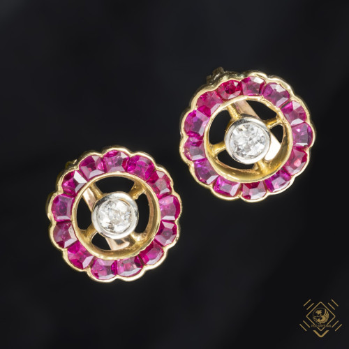 Diamenty starego szlifu otoczone szafirami w niezwykłym kolorze głęboko nasyconego różu. Okrągła kompozycja inspirowana formą kwiatu. Wspaniała, delikatna ozdoba kobiecego ucha.