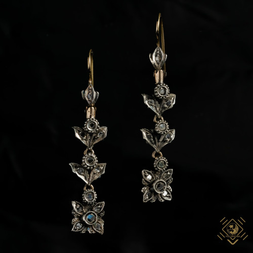 Koktajlowa forma złożona z ruchomych elementów nawiązująca kształtem do jakże wdzięcznej tematyki florystycznej. Na bazie złota posadowione w srebrnej oprawie pyszniące się delikatnym blaskiem rozety diamentowe.