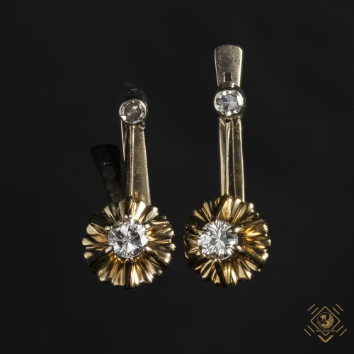 Niewielkie lśniące diamenty oprawione w wysokiej próby złoto. Prosta a jednak niezwykle dekoracyjna oprawa ozdobiona dodatkowo niewielkimi rozetami diamentowymi.