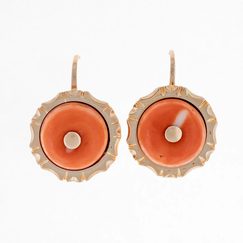 Przepiękny naturalny koral szlachetny ( collarrium rubrum ) barwy jarzębiny z delikatną białą plamką oprawiony w złoto. Kolczyki wykonane w I połowie XX wieku, opieczętowane krakowskimi znakami probierczymi.