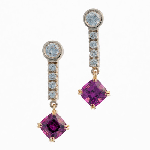 Eleganckie kolczyki koktajlowe, których niewątpliwym atutem jest prosta forma oraz dwa niezwykłe rodolity. Te dość rzadkie minerały należą do grupy granatów i charakteryzują się wspaniałą fioletowo-różową barwą, która podkreślona delikatną diamentową poświatą daje niesamowity wizualny efekt.