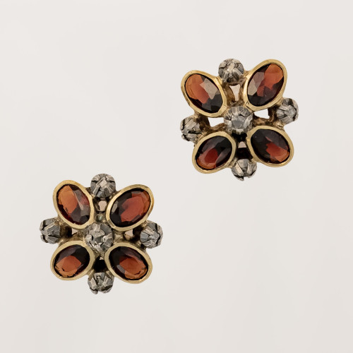 Subtelny, bardzo kobiecy wzór w formie niewielkich kwiatuszków. W złotych ciągłych oprawach umieszczono fasetowane granaty, których niesamowity burgundowy odcień wspaniale współgra z delikatnym lśniącym połyskiem zakutych w srebro diamentowych rozet.