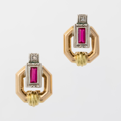 Oryginalna konstrukcja kolczyków nawiązująca w swojej formie do geometryzującej biżuterii charakterystycznej dla epoki Art Deco. Połyskujące rozety diamentowe oprawione w srebro w towarzystwie dwóch rubinowych syntez.