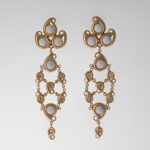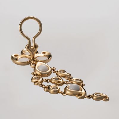 Wspaniały projekt o lekko romboidalnym kształcie wykonany w złocie Ruchome miękko zakończone elementy połączone niewielkimi, złotymi ogniwami zdają się płynąć przy każdym ruchu głowy. Całość dekorują diamenty w szlifie brylantowym oraz obłędne piękne opale lechosos (z hiszpańskiego - mleczny ).