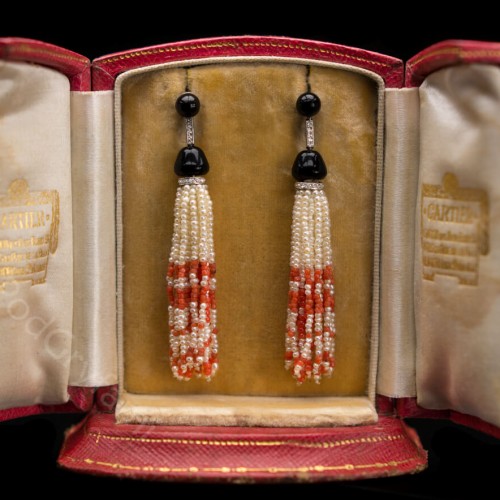Niepowtarzalny styl Art Deco od lat fascynuje nowatorską formą, która wyniosła biżuterię na artystyczne szczyty. Prezentowane kolczyki są tego znakomitym przykładem. Zaprojektowane i wykonane w formie fikuśnych frędzli utworzonych z idealnie dobranych niewielkich perełek i koralików. Intensywny pomarańcz korali wspaniale komponuje się z kremowo białą barwą pereł. Całość spina delikatna obręcz wysadzana diamentami umocowana pod czarno połyskującym onyksem. Dodatkowym elementem zdobiącym jest diamentowy sztyft łączący onyks mocujący frędzel z onyksem kaboszonem maskującym sztyft zapięcia. Kolejnym atutem jest bezpieczne i wygodne w użyciu zapięcie. Pewnego smaczku nadaje również eleganckie prezentacyjne pudełko Cartiera, w którym umieszczono kolczyki, chociaż same kolczyki nie posiadają sygnatury tej znamienitej firmy. Pochodzenie: Poprzednio wlasnosc pani Thelma Glyn-Hughes, żony Brigadier Hugh Llewellyn Glyn-Hughes CBE, DSO (1892-1973) Sekretarza drużyny rugby Barbarians.