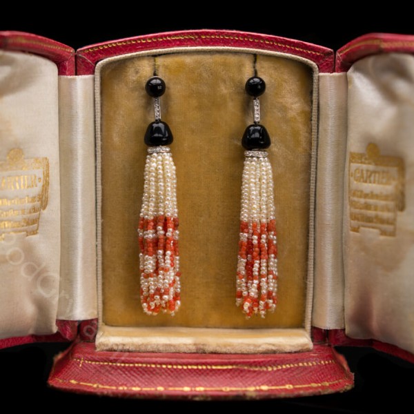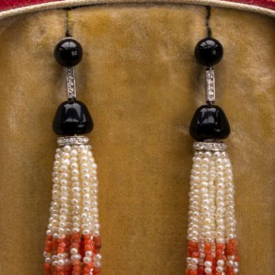 The unique style of Art Deco continues to fascinate with its innovative form that took jewelry to its artistic zenith. The earrings presented here are a perfect example. Designed and formed into frisky fringes made from perfectly matched small pearls and beads. The orange of the beads brings out the intense creamy white color of the pearls. The whole piece is then bound by a delicate rim of diamond studded black onyx. An additional decorative element is the diamond pin, connecting the tassel and clasp, masking the pin. The fastener is also safe and comfortable to use. The piece is presented in a Cartier box, although the earrings do not bear any markings from that distinguished brand. Origin: Previously owned by Mrs. Thelma Glyn-Hughes, wife of Brigadier Hugh Llewelyn Glyn-Hughes CBE, DSO (1892-1973), Secretary of the Barbarians Rugby Team.