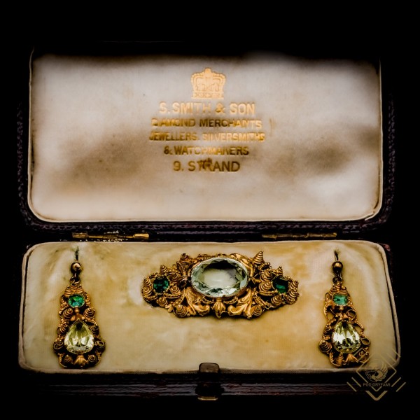 A unique jewelry set including earrings and a brooch made in the first half of the 19th century. The intricately woven filigree combined with rocaille ornamentation creates a wonderful setting for the emeralds and rare chrysoberyls. The style is complimented by the fact that individual parts of the set differ in small details. We especially recommend this piece for lovers of historical jewelry.